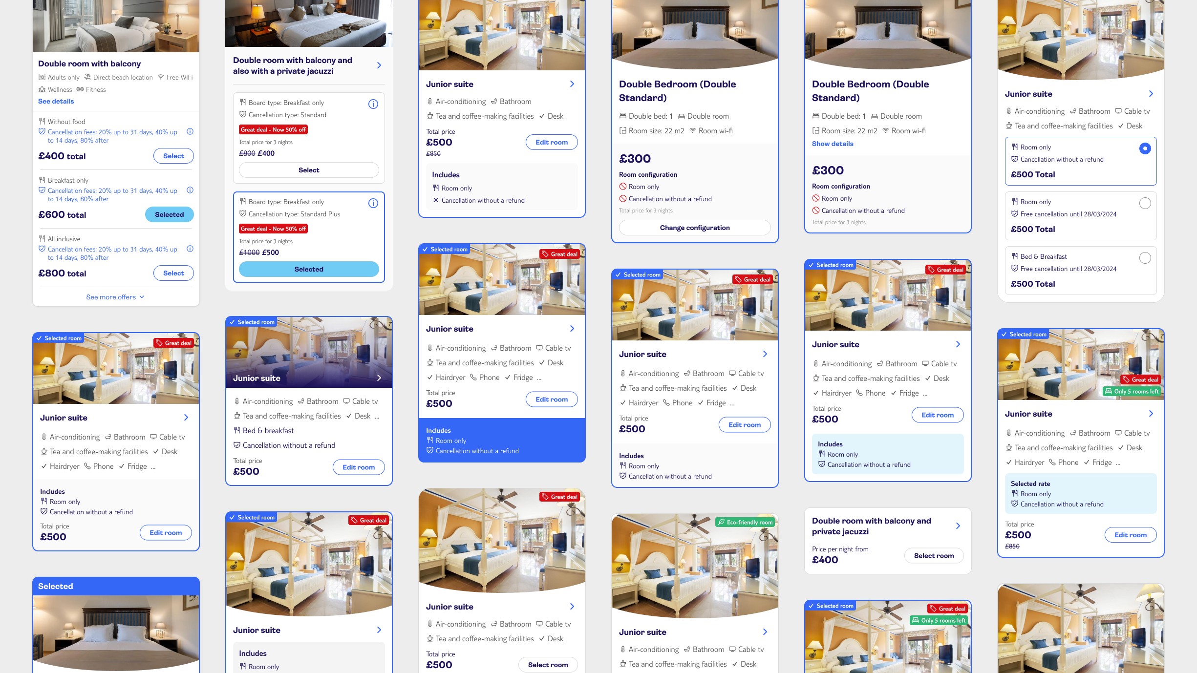 Exploration focused on how hotel details and offer configuration could coexist without overwhelming the page. Most concepts tested different ways of surfacing configuration options, as decisions around dates, guests, room types, board, and cancellation directly shaped the structure of the room section.