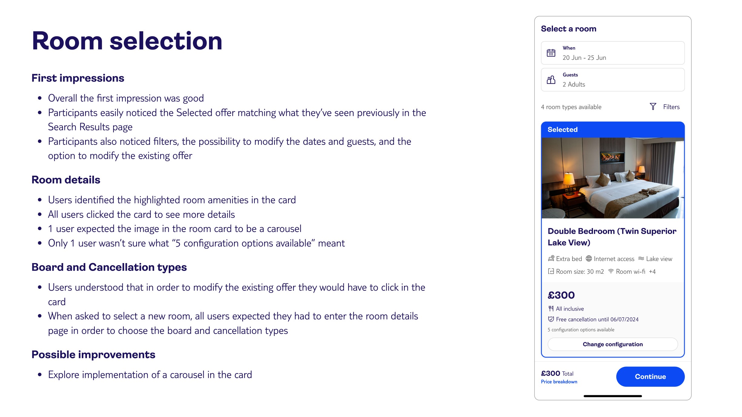 Testing showed that while consolidating everything into a single page seemed appealing, exposing too much configuration at once increased cognitive load. The strongest balance was achieved by anchoring configuration within the room details context, where users naturally focused before progressing.